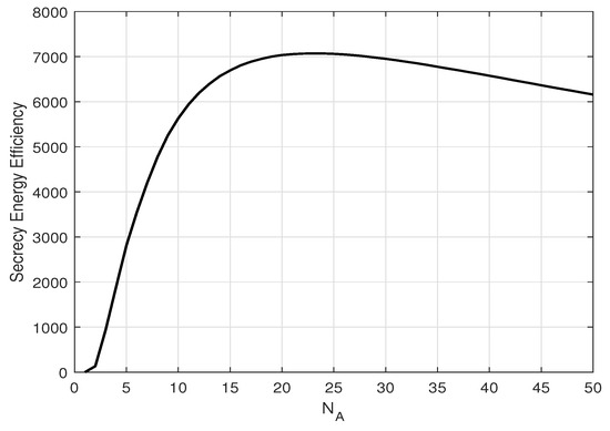 Figure 9. Secrecy energy efficiency, ζ , versus N A when optimal α and optimal power P is used; β = 0.1 and δ = 0.1 .