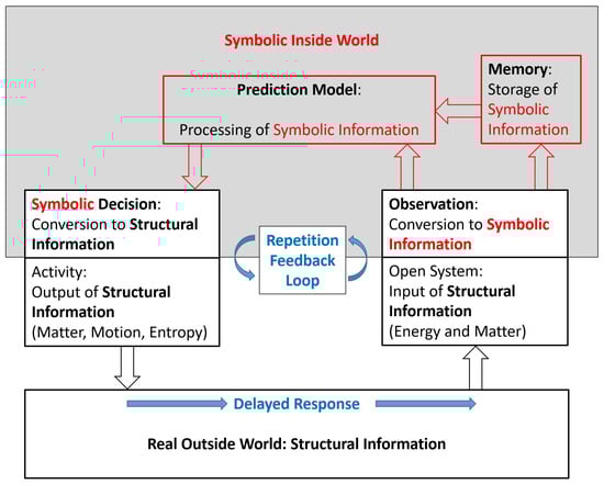 Let a symbolic decision be a physical decision in the form of structural information that is triggered by symbolic information; see the following section. For example, for humans, the consequences of “speech acts”, which are “doing things with words” (Austin 1962, Bühler 1965) [101,102], are typical symbolic decisions. When, at her wedding, the bride declares “yes, I will”, then this symbolic message of just three words given to the audience will dramatically change her future social and personal life. When, in a market, some bargain ends with “deal”, then the offered goods will instantaneously exchange their owners and will face an altered fate. Such a deal is usually the result of a cost–benefit analysis performed by the mental prediction models of the participants. As an aside, the German word for “to exchange” is “tauschen”, a word that has common roots with “täuschen”, meaning “to deceive”, to mislead the opponent’s prediction model.