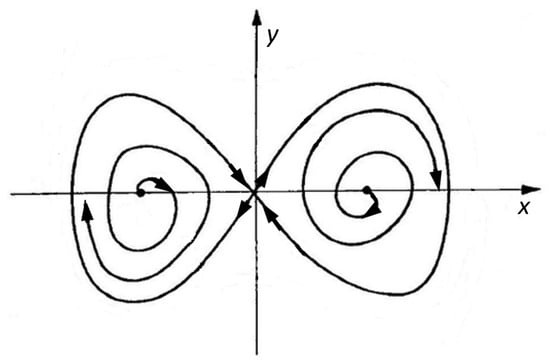 A simple saddle-type homoclinic orbit is shown in Figure 3. A related possible system of canonical-dissipative equations (Graham 1973, 1981, Feistel and Ebeling 1989) [98,99,100] is