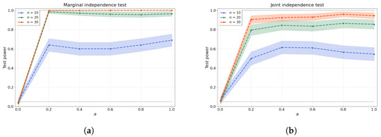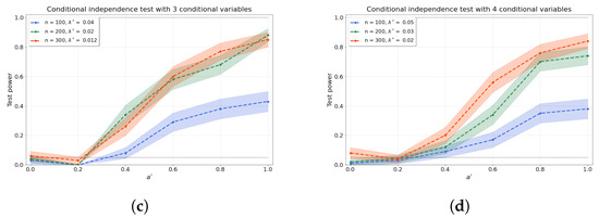 where is commonly defined as the median heuristic, . Replacing any characteristic kernel by the se-t kernels for bivariate independence tests (based on hsic) and for joint independence tests (based on d-variable Hilbert–Schmidt independence criterion (hsic)) is straightforward and does not require further theoretical investigation besides evaluating numerically the validity and power of the tests (see Section 4). However, the application of se-t kernels to conditional independence tests needs further theoretical results, as we discuss next.