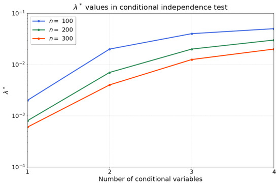 We consider the conditional independence test, which generates samples under the null hypothesis based on the cpt, and uses the sum of hscics over all samples as its test statistic. The cpt defines a permutation procedure that preserves the dependence of Z on both X and Y while resampling data for X that eliminates any potential dependence between X and Y. This procedure results in samples according to the null hypothesis, . We use this procedure whenever permutations are required as part of the conditional independence test. Given the computation of the hscic is based on a kernel ridge regression, it requires to set a regularisation strength , which has been manually chosen previously [18]. Generally, our aim is to have type-I error rates close to the allowable false-positive rate . However, choosing inappropriately may result in an invalid test (type-I error rates exceed if is chosen too large), or in a deflated test power (type-I error rates are well below and type-II error rates are high if is chosen too small). Thus, we must define an algorithm that conducts a search over a range of potentially suitable values for and assesses each candidate value by—what we will call—an evaluation rejection rate.