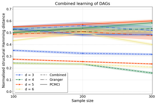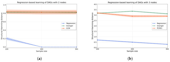 By sweeping , we go from linear dependence between and at to nonlinear dependence at , where we recover the model in Equation (11) with . We thus expect high accuracy from Granger causality at , where there is stationarity and linearity [6]. As r increases, we expect that our regression-based approach will achieve more accurate results, and the results of Granger will degrade as the assumption of linearity will not be met. As expected, Figure A2 shows the improved prediction accuracy (lower shd) of our regression-based approach as r is increased, reaching shd of (versus for Granger causality) at .
