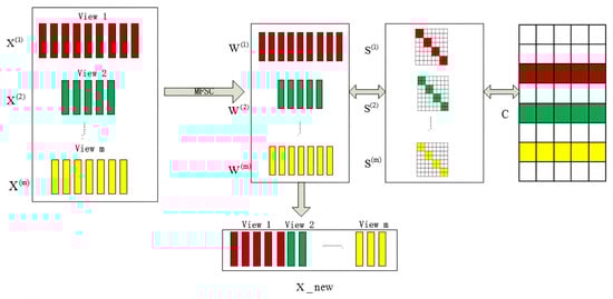 Suppose the dataset  denotes the data of the v-th view,  denotes the feature number of the v-th view, and n denotes the number of data. The feature selection matrix is , the clustering label is , and the subspace representation coefficient , where k denotes the cluster number. The MFSC model is defined as follows: