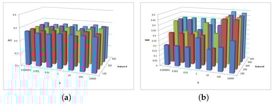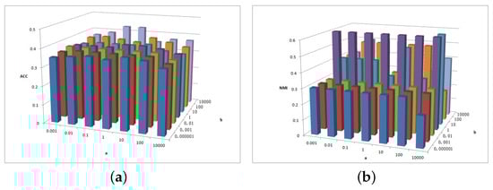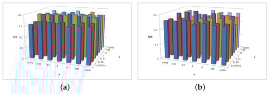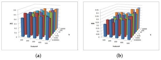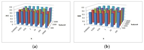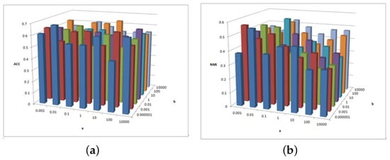 Figure 13a shows the clustering ACC of parameters b and  in the BBCSport dataset. The magnitude of ACC value difference in this figure is 0.05, and the ACC is insensitive to parameters  and  in the BBCSport dataset. Comparatively, it has high ACC with  and a = 10,000. Figure 13b shows the clustering NMI of parameters b and  in the BBCSport dataset. NMI is sensitive to , and NMI has a greater value when  and .
