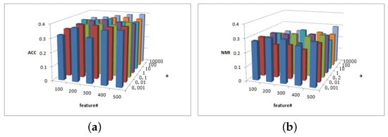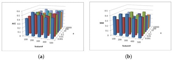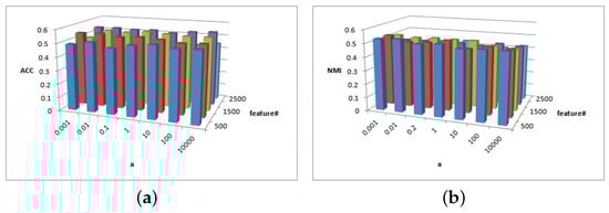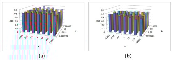 Figure 14a shows that ACC is insensitive to  but, when , its performance is better. Figure 14b shows the NMI performance for parameters  and . NMI is not very sensitive to  and , and, when  is larger and  is smaller, NMI is relatively larger.