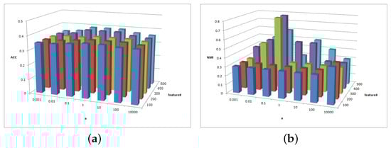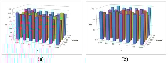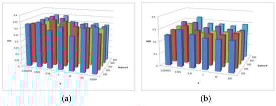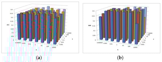 Figure 5a shows that the ACC is insensitive to parameter  and insensitive to parameter  on interval  or . Figure 5b shows that the NMI is insensitive to parameter  but is sensitive to parameter . When , the NMI value is larger.