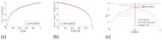 Gradient explosion: as shown in Figure 2, in (a), when , , there is a “gradient explosion” phenomenon, which leads to the failure of model training to converge. In (b), when , the , which also leads to the phenomenon of “gradient explosion”, which then leads to the failure of model training convergence. In (c), the optimal confidence obtained by optimizing Equation (5) is theoretically found at the intersection of , , and . However, since the alternating training model may not be able to find the Nash equilibrium point, we urgently need to reconstruct a more stable optimization function to replace Equation (5), so as to ensure that the training model of the DIM method can provide a stable gradient computation, as well as to ensure that the training process will not appear as the phenomenon of a “gradient explosion”.