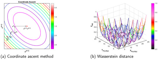 The Wasserstein distance approximation is solved using the optimal transport Sinkhorn algorithm, which, according to Equation (8), is essentially an iterative approximation using an immobile point equation, and the process of solving the immobile point equation is a Coordinate Ascend. In Figure 3a, we give the one-dimensional case, using the Coordinate Ascend method to solve and in the one-dimensional case. From the figure, we can see that, first, the variables and are initialized randomly. Second, is updated with and according to the first equation of Equation (8), and after obtaining , is updated with according to the second equation of Equation (8). and are obtained after finitely alternating many iterations, is updated with , to update , and then we obtain and , which are the optimal approximate solutions. Finally, using the and obtained from the above solution, the cost matrix C is updated to obtain the Wasserstein distance approximation to calculate the distance between any two distributions.