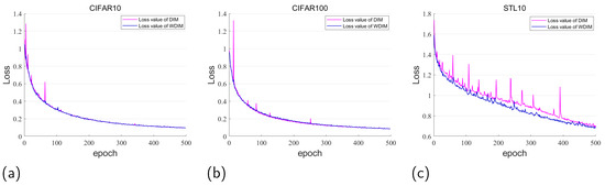 We compare the training models of the DIM method and WDIM method on CIFAR10, CIFAR100, and STL10 datasets, and find that the loss value of the training model of the DIM method always appears as “nan” when the , which leads to the phenomenon of the “gradient explosion” that we mentioned. Therefore, after repeating the experiment several times, we chose one successful training of the DIM method as a comparative experiment. As can be seen in Figure 4a, the loss value of the DIM method in the first 50 epochs on the public dataset CIFAR10 shows large fluctuations, but the training of the model still converges in the end. On the contrary, in our WDIM method, the loss value has been in a slowly decreasing state, and the model training is very stable and eventually performs as well as the DIM method. In addition, on the CIFAR100 dataset, as shown in Subfigure (b), the training of the DIM method still has some fluctuations, while our method still maintains a relatively stable training pattern, and it is obvious that our WDIM method maintains a highly significant level of training models. As can be seen in Subfigure (c), due to the small number of training samples in the STL10 dataset, in this case, the gradient direction found in the optimization process is somewhat different from the optimal gradient direction, so both methods have some fluctuations in the process of model training, but such fluctuations do not affect the final convergence of the model. The loss fluctuation calculated by our method is smaller and always smaller than the loss value of the DIM method. This fully reflects that the WDIM method is more capable of providing effective gradient training and faster convergence. In terms of overall performance, our method WDIM performs at least as well as the DIM method on the basis that the DIM method can train the model stably, and more importantly, the WDIM method consistently performs very well on the training model.