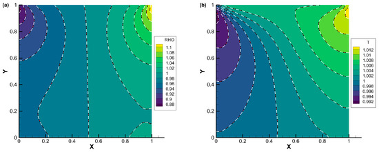 In order to achieve a more precise predicted equilibrium state, the evolution equation of the predicted macroscopic conservative variables (as shown in Equation (36)) is introduced in DVM-II and DVM-III. It is evident that the effective time step size of Equation (36) is much larger than the collision time in this scenario. This implies that the macroscopic governing equation takes precedence in the continuum limit. Consequently, the flow field can be accurately described by the Navier–Stokes equation in this regime. Naturally, DVM-III yields a more accurate predicted equilibrium state compared to DVM-II since the flux Jacobian is calculated using the Navier–Stokes equation in this method.