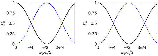 The dynamics arising from the Hamiltonians and for actual values of g and does not in general constrain the system to the states , , or Full solutions are depicted in Figure 2. For the parameters given, the probability that the system is found in a state different to , , or is, however, negligible.