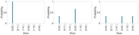 Creation of the superposition from , for . The values of and g are chosen as in Figure 1. Each sequence shows the initial state (left), the intermediate state (center), and the final state (right), where and for suitable choices of times and . The probability that the system is in state is depicted at the given time in the sequence. The probability that the system is in a state different to , , or is less than .