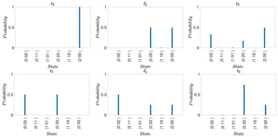 Creation of the superposition from the post-selected state using the operations , for . The values of and g are chosen as in Figure 1. Each sequence shows the initial state (left), the intermediate state (center), and the final state (right), where and , as defined in the text. The probability that the system is in state is depicted at the given time in the sequence. The probability that the system is in a state different to , , or is less than .