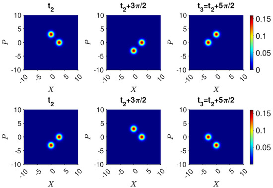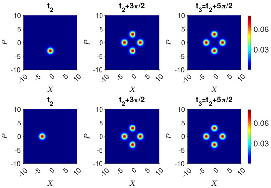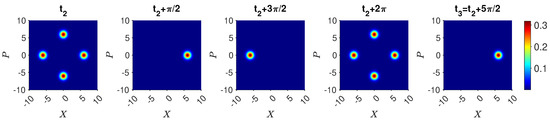 The dynamics for are shown in Figure 5. The inverse is achieved by first transforming using the nonlinear interaction modeled by the Hamiltonian of (43). Defining where the interaction time is , the state becomes for all integers k. We identify