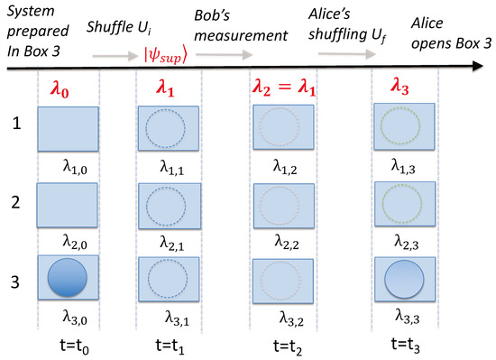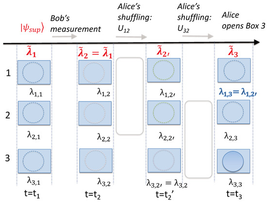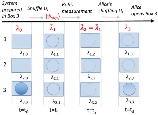 Whenever, Alice measures that the ball is in box 3 (i.e., when she confirms the system at time is in the state ), it is certain that Bob found the ball in the box he measured. This gives the paradox since, if Bob’s measurement is non-disturbing, it would be concluded that the ball was in both boxes with certainty at time , just before his measurement.