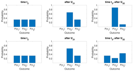 The dynamics corresponding to Alice’s transformations if (top row) Bob detects N photons in box 1 at time , or (lower row) if Bob detects the photons are not in box 1 at time . The histograms give the probabilities for detecting N photons in box K. The probability that the system is in state is depicted at the given time in the sequence. Here, we show the initial state after Bob’s measurement at time (left), the state generated at time after Alice’s transformation (center), and the state generated at time after Alice’s further transformation (right). The final state after Alice’s total transformation is (35) (top) or (37) (lower) to an excellent approximation. The probability that the system is in any other state apart from , or is less than . The solutions are for .
