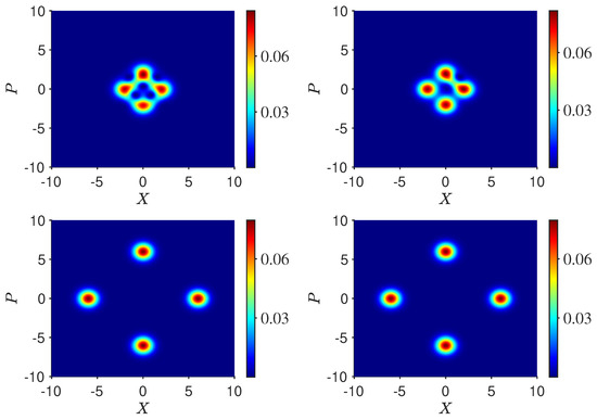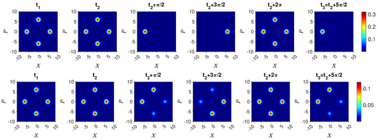 where gives the harmonic oscillator angular frequency, represents the strength of the nonlinear term, and is the field number operator. We have taken . Here, k is a positive integer. After an interaction time of , the system with initially prepared in a coherent state becomes