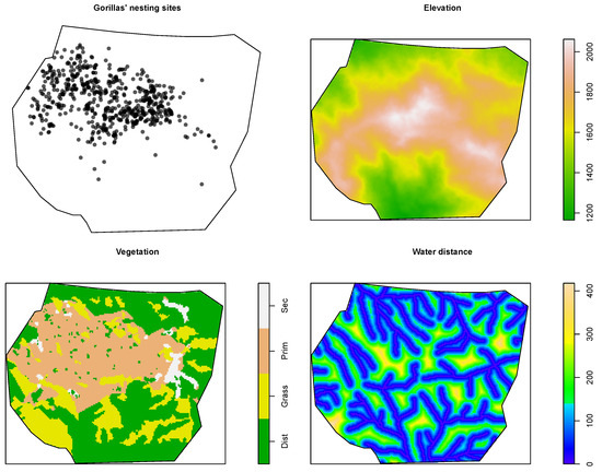 The data considered in this work come from a study by the Wildlife Conservation Society’s Takamanda-Mone Landscape Project (https://cameroon.wcs.org, accessed on 10 January 2023) on the nesting habits of gorillas in the Kagwene Gorilla Sanctuary, an area in Cameroon. The dataset is a point pattern, i.e., a collection of points giving the exact spatial locations of nesting sites of gorilla groups observed in the area of interest. The spatial location is given in the Universal Transverse Mercator (UTM) coordinate system (Zone 32N) and expressed in metres. The observation area T, also known as the observation window in standard point process terminology, is an irregular polygon marking the boundary of the Kagwene Gorilla Sanctuary. Further details about the data collection are reported in [15]. The dataset is very rich; our working example will employ part of the available information.