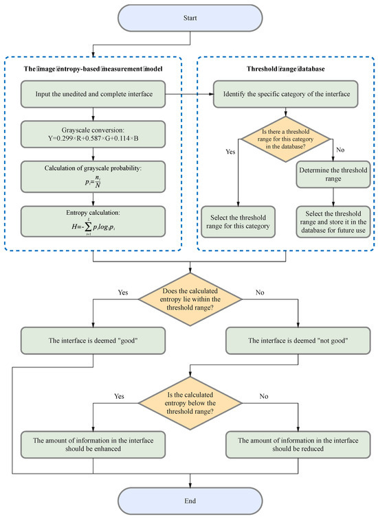 The procedure of the evaluation method is illustrated in Figure 1. Initially, the image entropy of the interface is calculated using the image entropy-based measurement model. The calculated entropy is then compared to a predefined threshold range, which serves as a benchmark for evaluating its quality. This threshold range corresponds to the category of the interface, with the determination process detailed in Section 3.2 below. Determined threshold ranges for specific categories will be stored in the database for repeated use, facilitating rapid and large-scale evaluation. In the next step, interfaces with entropy values within the threshold range are deemed satisfactory and labeled as “good”. Conversely, those outside of the threshold range are labeled as “not good”, indicating a discrepancy in the amount of information presented.