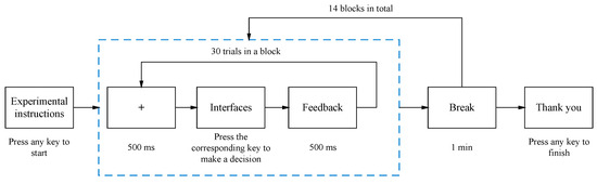 Participants adhered to the on-screen instructions. Similar to the questionnaire-based threshold determination approach, there were 15 image entropy levels designated for each interface, with each level being presented twice during the experiment. Participants were tasked with completing decision-making tasks for all 14 interfaces, culminating in a total of 420 trials. Each trial commenced with a centered cross shown on the screen for 500 ms, followed by the display of an interface. Participants were then required to rapidly ascertain whether the interface presented any abnormal data and to press the corresponding key to make their decisions. All behavioral data were meticulously logged using E-prime 2.0 software. Figure 6 provides an illustration of the experimental process.