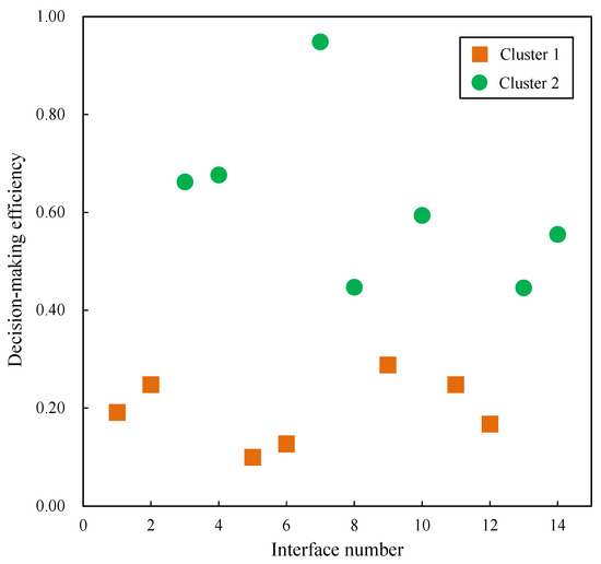 The analysis began by randomly selecting two data points to serve as the initial cluster centers. The Euclidean distance was used to assign each data point to the nearest cluster center. The cluster centers were adjusted to minimize the distance from the centers to each data point, and this process was repeated until convergence was achieved. Finally, the first cluster center, representative of the low decision-making efficiency group, showcased a value of 0.20. In contrast, the second cluster center, standing for the high decision-making efficiency group, displayed a value of 0.62. Following this classification, interfaces 1, 2, 5, 6, 9, 11, and 12 were categorized into the first cluster, labeled as “Cluster 1”. Conversely, interfaces 3, 4, 7, 8, 10, 13, and 14 were assigned to the second cluster, labeled as “Cluster 2”. Visual inspection of the clustering results can be achieved through a scatter plot, as shown in Figure 8, where data points are distinctly shaped and colored based on their assigned cluster.