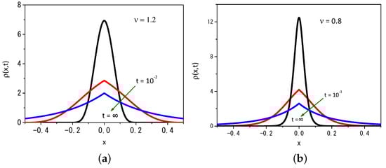 Profile of the distribution obtained from Equation (2) for (a) and (b) by considering different values of time. For illustrative purposes, we consider , , , and .