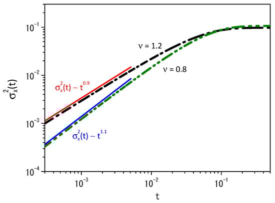 Time-dependence of the mean square displacement, i.e., , obtained from Equation (2) when (green line) and (black line). The red and blue lines were incorporated to evidence the behavior of the mean square displacement for short times. Again, for illustrative purposes, we consider , , , and .
