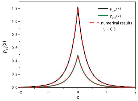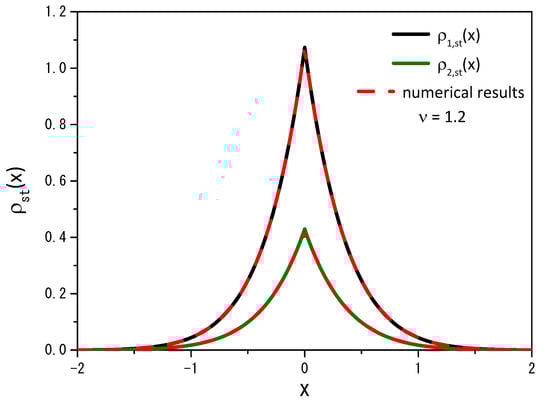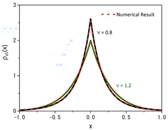 Equation (11), for the particular case (or ), leads to the result obtained in Ref. [14] for the normal case. Figure 4 illustrates the numerical result obtained from Equation (2) for long times, i.e., in the stationary scenario, and the previous analytical result, obtained for Equation (11). It reveals a strong agreement between the numerical and analytical results when we examine two different values of the parameter: the analytical result depicted for , with a solid black line and , with a solid green line, while the dotted red line represents the numerical result. In both cases, we employ a stochastic resetting rate of .