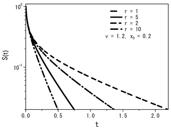 Time-dependence of the survival probability using Equation (13) for various values of the resetting rate r, with for the boundary conditions and . We consider, again, , , and .