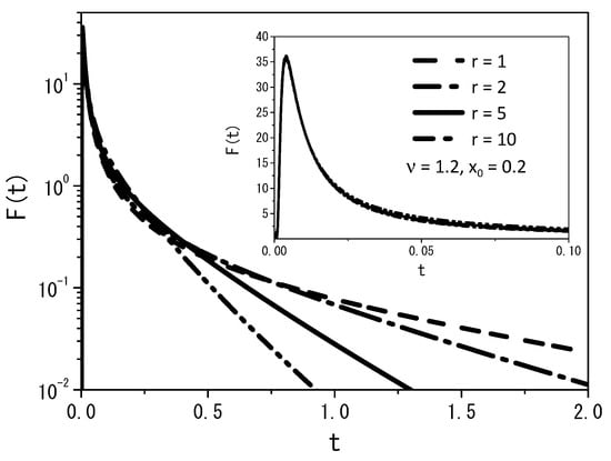 where represents the probability distribution of finding a particle around position x at time t, r is the rate under which particles stochastically reset their positions to , is a parameter associated with the properties of the media, and D is a constant corresponding to the usual diffusion coefficient. It is worth mentioning that we will also consider some extensions of Equation (2) and implications for the reset process. The solution of this equation in the absence of the resetting term, that is, for , can be found in terms of the q-exponential present in the Tsallis formalism [11], which is based on the following entropy: