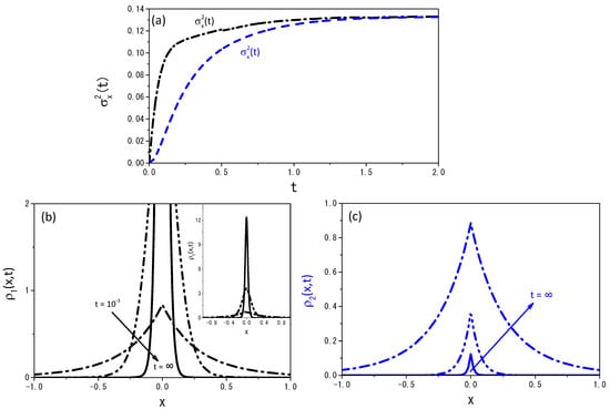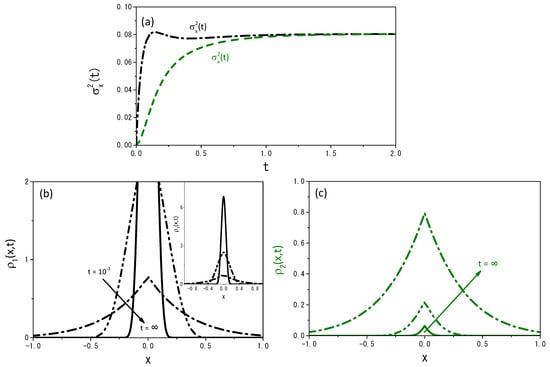 Figure 8 and Figure 9 illustrate the behavior of the mean square displacement and the distributions obtained from Equations (19) and (20) for different values of . For Equations (19) and (20), it is also possible to find the stationary solution, i.e., the one in the limit . We consider that in this limit, is nearly equivalent to , and thus we solve the equation