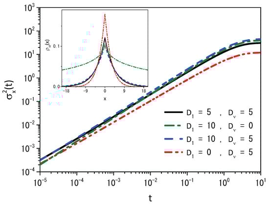 Time-dependence of the mean square displacement obtained from Equation (30) for different values of diffusion coefficients. The inset corresponds to the stationary distribution for different diffusion coefficients. We consider, for illustrative purposes, , , and the initial condition , for .