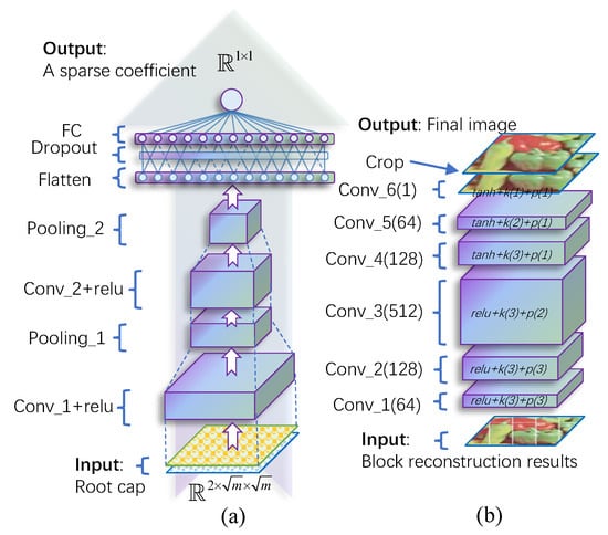 This paper firstly trained the feeder root branches individually; a cost function in Equation (4) was designed, where and are the predicted and ground truth sparse coefficients, respectively, and is a random, small-enough value to prevent the denominator to be zero. This cost function combines the absolute error and relative error, which gives better results than the commonly used mean square error function in our test. is obtained by setting the block size L as 32 and decomposing each block on sparse basis. Both DCT and Haar wavelets are considered as the sparse basis. 0/1-Bernoulli and random Gaussian matrices are tested as measurement matrices. The virtual m is set as 361, which corresponds to a max MR of . More measurements will counteract the compressing benefit of CS for most applications. Users can set it as other values according to their needs. A predefined measurement matrix is easier to implement in real applications, so this paper chooses seven predefined MRs from 0.05 to 0.35 with a step-size of 0.05. All kernel sizes are set as 3, the stride step-size for convolution layer and max-pooling layer are set as 1 and 2, respectively. The convolution kernel numbers are set as 64 for and . The issue of deciding a minimum kernel number remains a challenge for researchers across the field of deep learning. The learning rate is initialed as 0.01 and drops to 0.00001 through polynomial decay during 3000 epochs of training. The dropout rate is set as 0.3.