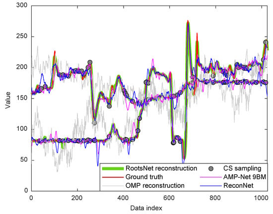 This section compares the proposed RootsNet with some state-of-the art methods on SET11; the PSNR in dB and SSIM are shown in Table 2. The test results of some deep learning methods come from recently published papers [14,26]. All tests in this paper use an MR range of 0.01–0.35, because higher measurement rates counteract the compressing benefit of CS, so five typical MRs are chosen in Table 2. The best and worst results are highlighted in red and green, respectively. A total of 512 feeder root branches are used in this test. Generally, deep learning methods have better reconstruction quality because the neural network models learned some a priori information during training. Block reconstruction leads to poorer performance due to the incurred block effect. Among all methods, the proposed RootsNet is sub-optimal in reconstruction quality for measurement rates above 0.1. RootsNet obtains the best performance in super-low MRs—those below 0.1—because only RootsNet is designed for sparse-coefficient-level reconstruction and it enables error correction through the rootstock net; other deep learning methods perform image-level reconstruction. A low measurement rate like 0.05 in this test brings reconstruction errors to the ground truth; these errors lead to the presence of artifacts in the final image if there is no error correction scheme. This study did not give attention to the effort of improving the reconstruction quality. For example, the structure of the rootstock net is very simple; there is more twist, and adding a cross-like layer connection may be helpful in improving the reconstruction quality.
