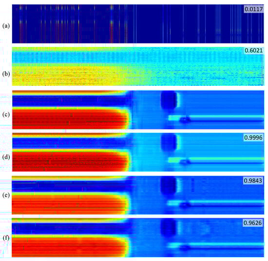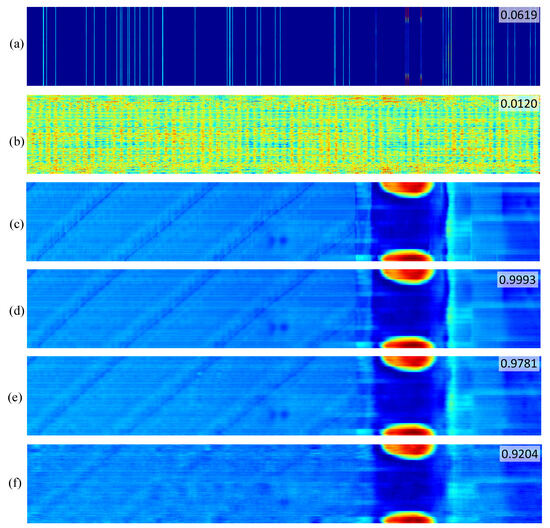 Measurement results of piece two under the measurement rate of 0.05 for pipeline. (a) CS sampling data; (b) OMP reconstruction; (c) ground truth by full-time wake-up sampling; (d) RootsNet reconstruction; (e) AMP-Net-9BM reconstruction; (f) ReconNet reconstruction. The proposed method successfully reconstructed a super-low measurement rate of 0.05 while traditional OMP algorithm failed.