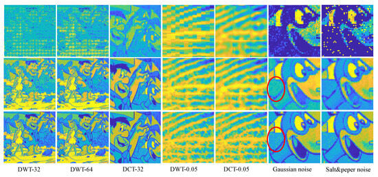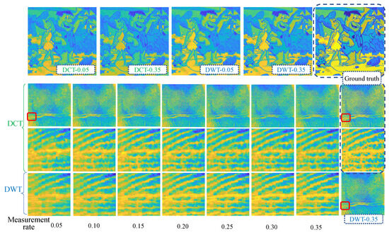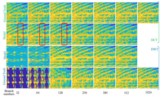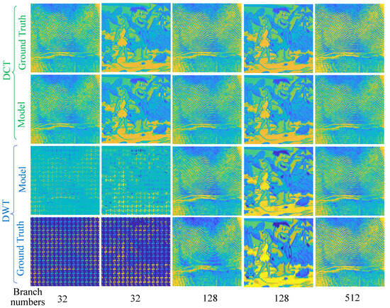 This section qualitatively evaluates the ability of the feeder root net module to reconstruct the sparse coefficients firstly. Figure 9 shows two images that were recovered from the reconstructed sparse coefficients by the feeder root net and the ground truth in SET11; zoomed-in views of are shown in Figure 10. Ground truth coefficients are set by ensuring that the rest of the coefficients beyond the feeder root branch have a number of zero. Only 32 feeder root branches show the general texture for DCT basis, while it needs at least 128 feeder root branches for DWT. The floor number for the DWT basis is decided through wavelet decomposition orders: this is 128 for 3-order decomposition and 64 for 4-order decomposition. The red square in Figure 10 highlights the block effect, i.e., a clear edge line between reconstruction blocks. The block effect under the 256 feeder root branches is more serious for DCT, but DWT incurs a small block effect itself by using the Haar wavelet. Generally, the DCT has a better visual quality because cosine waves are smoother than Haar waves, as shown in Figure 11c. Using other wavelets like and can lead to smoother images than using the Haar wavelet. More feeder root branches lead to better texture detail due to more detail wave components being used, such as higher frequency cosine waves in Figure 11a,b. The visual quality of the ground truth images does not show significant differences after a certain branch number for both DWT and DCT bases; this means setting the feeder root branch number as 384 or 512 in this dataset. This is a good trade-off between reconstruction quality and efficiency.