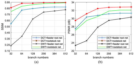 The influence of feeder root branch number on average reconstruction quality in SET11 by (a) SSIM and (b) PSNR. The branch number is 256.