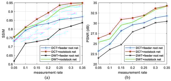 Measurement rate is a key parameter in CS that shows data compression ratio. Figure 14 shows the reconstruction results under 256 branches for different MRs. Generally, higher MRs lead to better reconstruction results but it is not so sensitive as branch numbers. An MR of 0.05 already shows the general texture, both for DCT and DWT basis. Under same MR, the quality of DCT basis is better than DWT basis. Figure 15 shows the quantitative results for different MRs with 256 branches. Both PSNR and SSIM almost linearly increase with measurement rate. Rootstock net also shows great improvements in reconstruction quality.