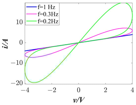 γ = 1, ε = 0.25, and η = 0.002. The i–v curve of the memristor with different frequencies (f), with an amplitude of 4 V for the sinusoidal signal input.
