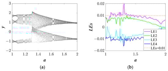 The bifurcation diagram and Lyapunov exponent spectra of system (3): (a) the bifurcation diagram of a ϵ (1, 2); and (b) the Lyapunov exponent spectra of a ϵ (1, 2).