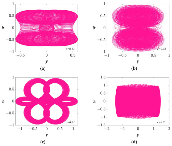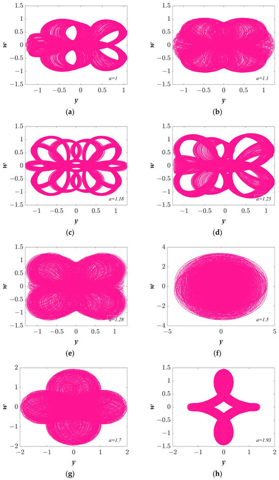 Setting the system parameters b = 1, c = 1, initial condition (IC) = (1, 0.1, 1, 0.5), and changing the parameter a, the Lyapunov exponent spectra and bifurcation diagrams were determined and are shown in Figure 2. The bifurcation diagram shows significant changes, indicating that system (3) is sensitive to parameter a. In addition, a wide range of quasi-periodic characteristics is shown in the bifurcation diagrams (see Figure 2a). As shown in Figure 2b, when parameter a is around 1.3, the LE curve has a positive value, which indicates the system is in a chaotic state. Some typical trajectories with the change in parameter a are displayed in Figure 3.