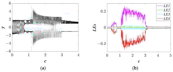 The bifurcation diagram and Lyapunov exponent spectra of system (3): (a) the bifurcation diagram of c ϵ (0, 4); and (b) the Lyapunov exponent spectra of c ϵ (0, 4).