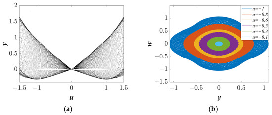 Amplitude control increases the robustness of the system, which is of great significance for engineering. The system parameters and IC were set as a = 1.25, b = 1, c = 1, and IC = (0, 0, u, 0). The bifurcation diagram with initial value z(0) = u is shown in Figure 6a. The bifurcation diagram exhibits symmetry to u = 0. In addition, when u is less than zero, the value of y decreases as the value of u increases; and when u is greater than zero, the value of y increases with the increase in u, indicating the amplitude of the phase trajectories can be controlled through the initial values. To intuitively reflect the changing process of the amplitude, the phase trajectory with different u values is plotted and displayed in Figure 6b. The phase trajectory gradually shrinks from u = −1 to −0.1. It is worth noting that the amplitude regulation of the initial value is also extreme multistability behavior.
