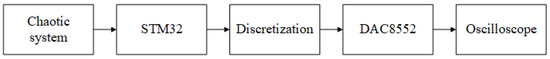 Analog circuits and digital circuits are two ways to achieve chaotic systems. Compared to the uncontrollable initial value of analog circuits, digital circuits have programmable characteristics, so digital circuits can realize the complex phenomena of chaotic systems. The digital circuit scheme is shown in Figure 9. A continuous chaotic system is fed into the STM32. The 32-bit main chip STM32F103C8T6 is used for data processing. The continuous signals are discretized using Euler’s algorithm as follows.