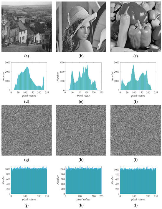 Encryption results of images Goldhill, Lena, and Pepper and their histograms. Plain images of (a) Goldhill, (b) Lena, and (c) Pepper; histograms of plain images of (d) Goldhill, (e) Lena, and (f) Pepper; ciphered images of (g) Goldhill, (h) Lena, and (i) Pepper; histograms of ciphered images of (j) Goldhill, (k) Lena; and (l) Pepper.