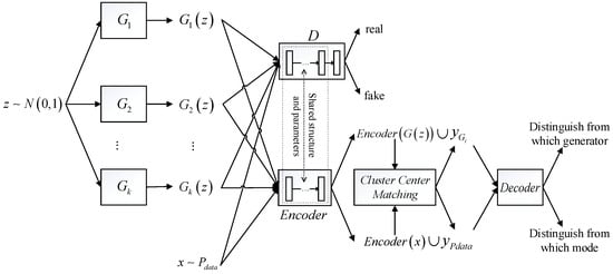 Our model differs from the above-mentioned multi-generator models mainly in two aspects. First, our model is composed of a set of generators, a discriminator, an encoder, and a decoder, which is architecturally different from the existing models. Moreover, the model is equipped with an algorithm for cluster center matching to maintain consistency between the distribution of the real and generated samples.