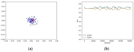 The training instability of GANs means that it is difficult for the learning processes of the generator and the discriminator to converge synchronously. From the perspective of data distribution, a possible reason is that the complexity of real samples’ distributions affects the speed of convergence for and . If the real samples are subject to a simple single-mode distribution, and will converge quickly and synchronously; otherwise, if the real samples are subject to a complex multi-mode distribution, it will be difficult for and to converge synchronously. These two phenomena are illustrated in Figure 2 and Figure 3, respectively.
