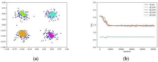 An example of the mode coverage and loss curve of an AE-GAN on a complex four-mode distribution. (a) The mode coverage of the AE-GAN, where blue points represent real samples and the others represent generated samples in which samples generated from different generators are denoted by different colors; (b) The loss curve of and of the AE-GAN.