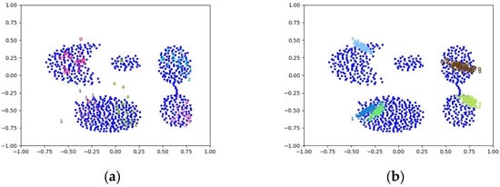 Noticeably, the clusters for each dataset are the same as in Figure 6, represented by the clustered blue points, and the generated samples that are classified by a model as a cluster are indicated by a uniform number with a specific color. Consequently, the accuracy of the classification results of a model can be visually exhibited as the purity of coloring for the clusters.