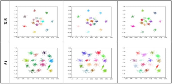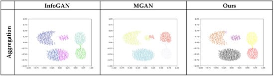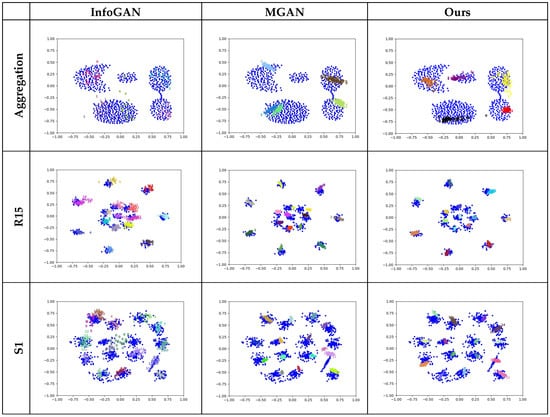 Apparently, InfoGAN and MGAN are able to only cover most rather than all modes, as shown in the diagrams for Aggregation and S1, where two or more clusters can be classified as one mode. Moreover, these two models are not capable of correctly classifying the missing modes, as shown for Aggregation, R15, and S1, where one cluster can be recognized as multiple modes. Consequently, an unreasonable division of the modes would result in terms of classification. In contrast, the AE-GAN can cover all the modes for these datasets and accomplishes preferable mode division through a more accurate and reasonable classification.